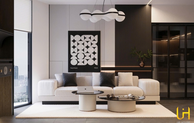 Phòng khách: Điểm nhấn là bộ sofa nỉ màu trắng kem nổi bật trên nền tường ốp gỗ đen sang trọng. Hệ đèn thả trần dạng bong bóng (Bubble Lamp) mang lại vẻ mềm mại, đối lập với sự mạnh mẽ của các mảng tường phẳng.