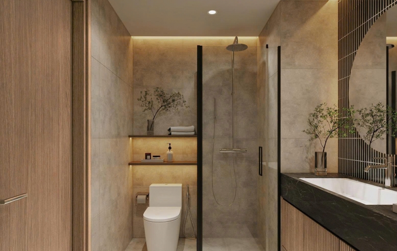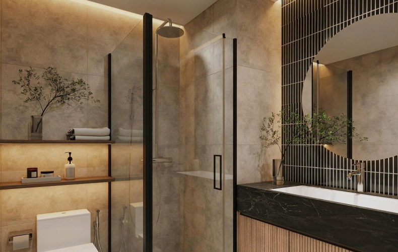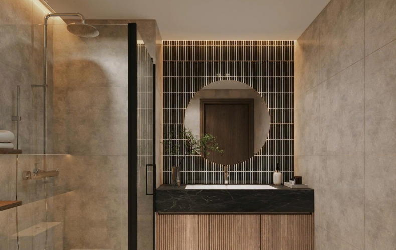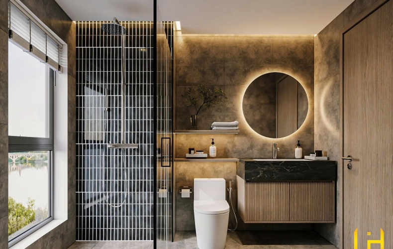 Phòng tắm: Sử dụng gạch giả đá xám và hệ gạch thẻ đen ốp dọc phía sau gương tròn, tạo điểm nhấn thị giác cực mạnh, mang phong cách của các resort 5 sao.