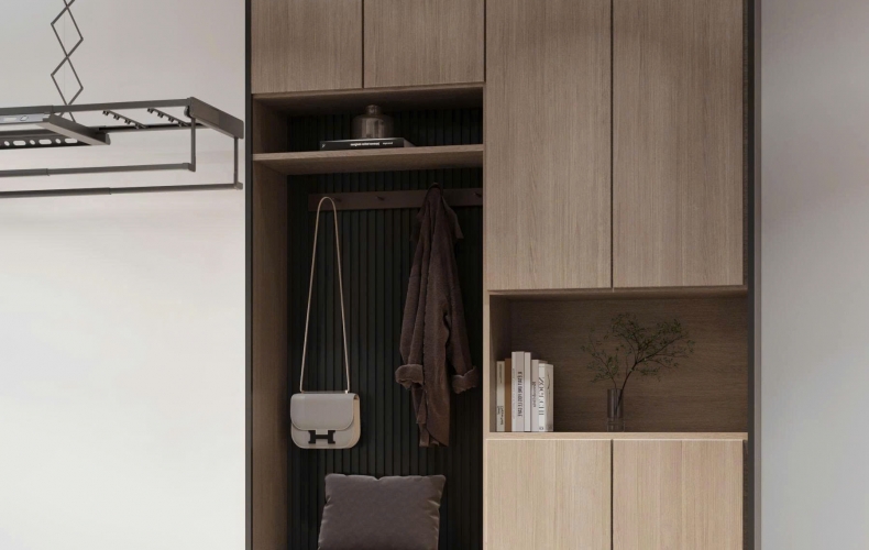 Sảnh vào: Hệ tủ giày tích hợp ghế ngồi và móc treo được thiết kế âm tường, tối ưu hóa công năng ngay từ bước chân đầu tiên vào nhà.