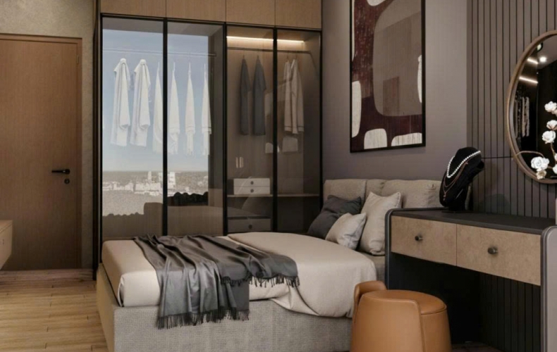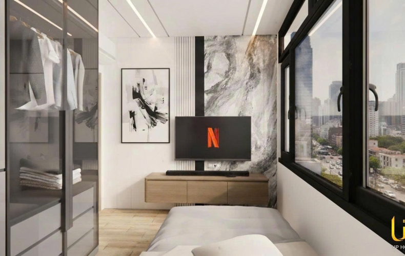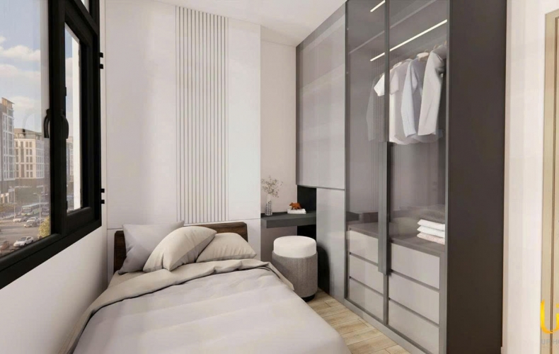 Phòng ngủ: Dù diện tích khiêm tốn nhưng nhờ hệ tủ quần áo cánh kính kịch trần và cửa sổ lớn đón trọn view thành phố, căn phòng trở nên rộng rãi và thoáng đãng hơn hẳn.