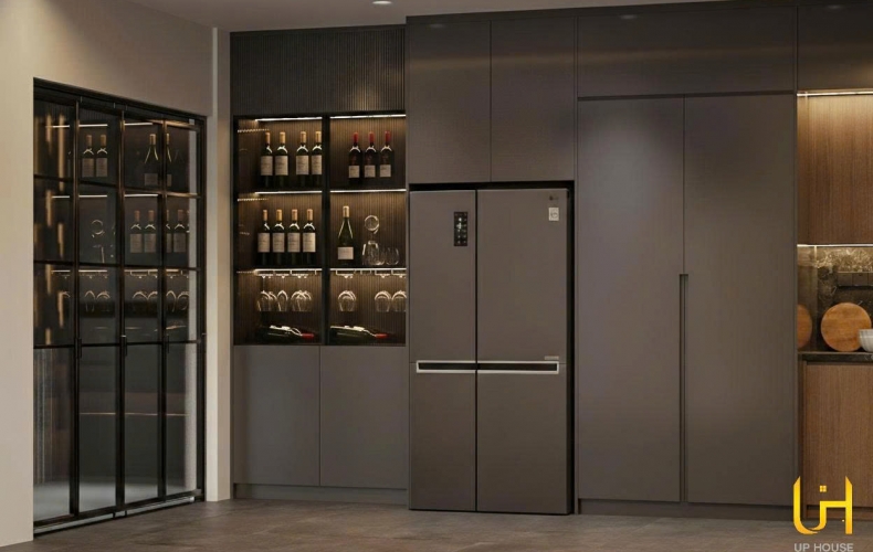 Phòng bếp & Bàn ăn: Sử dụng hệ tủ kính đen xuyên sáng (Smoked Glass) kết hợp bàn ăn mặt đá xám, tạo cảm giác như một quầy bar thượng lưu ngay tại gia.