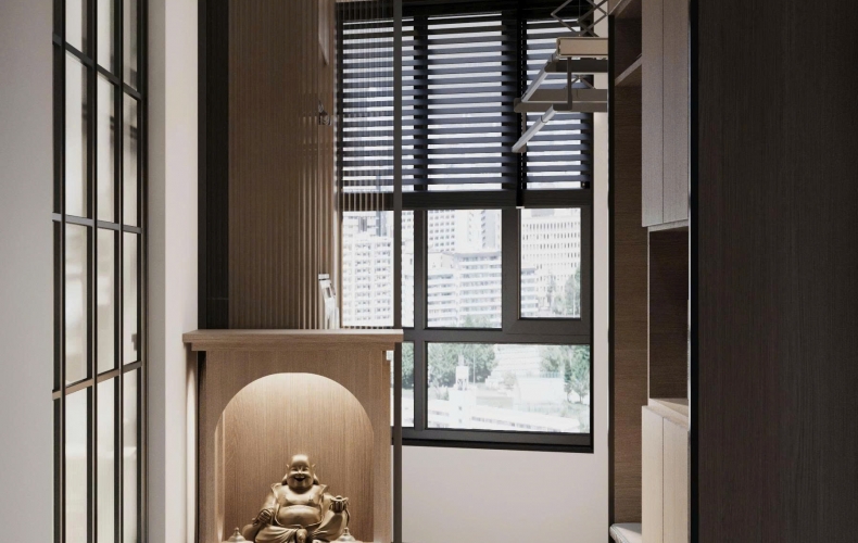Khu vực thờ tự: Được bố trí tinh tế với vách ngăn CNC kính sọc, vừa đảm bảo sự trang nghiêm, riêng tư vừa không làm bí bách không gian.